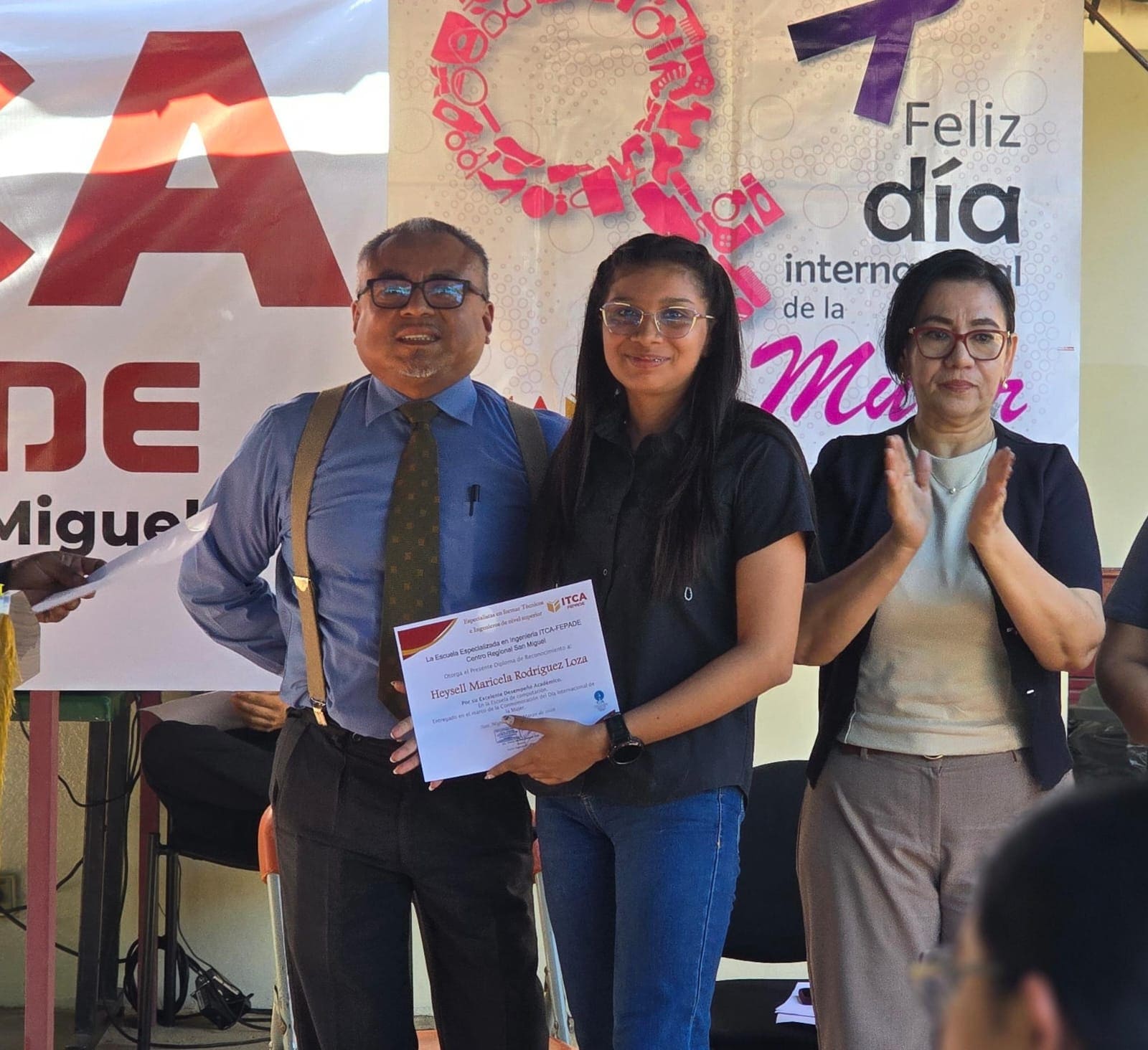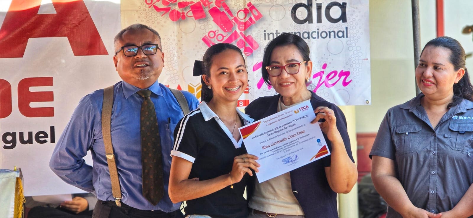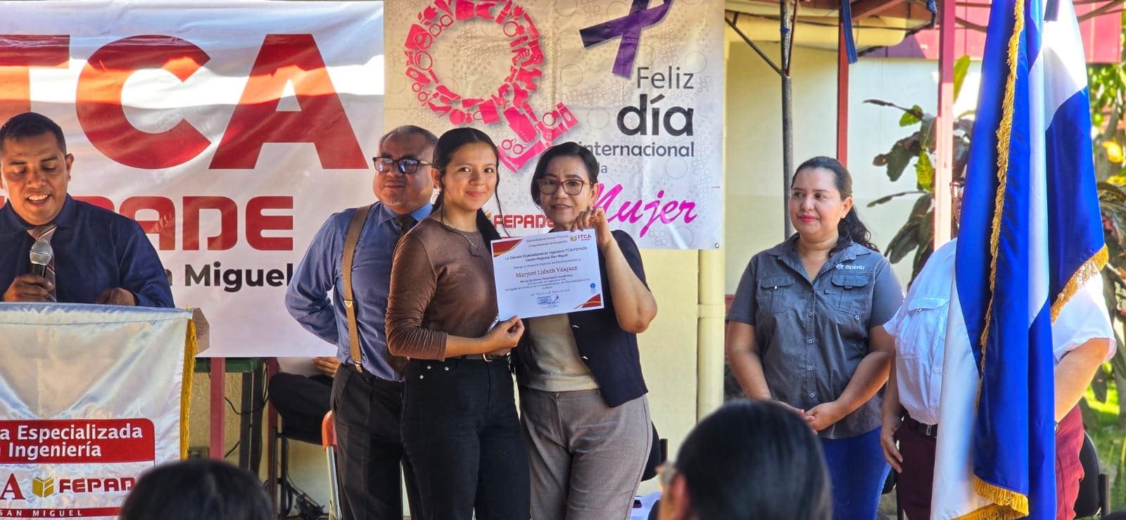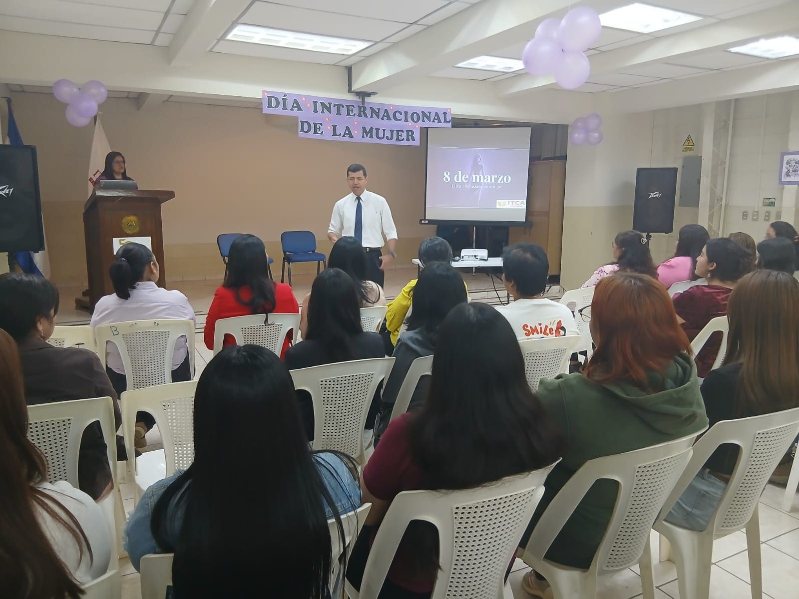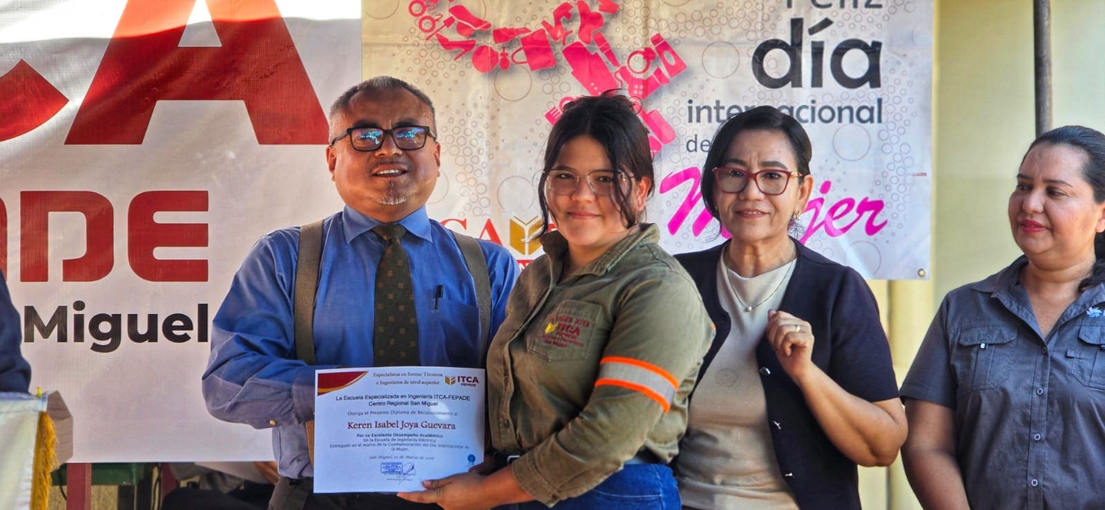 En ITCA-FEPADE San Miguel, el 9 de marzo, estudiantes, personal administrativo y académico participaron en un acto especial que incluyó palabras del Director Regional, una charla sobre prevención de la violencia contra la mujer impartida por una representante de ISDEMU San Miguel, reconocimiento a estudiantes destacadas y presentaciones artísticas con cánticos y poemas.