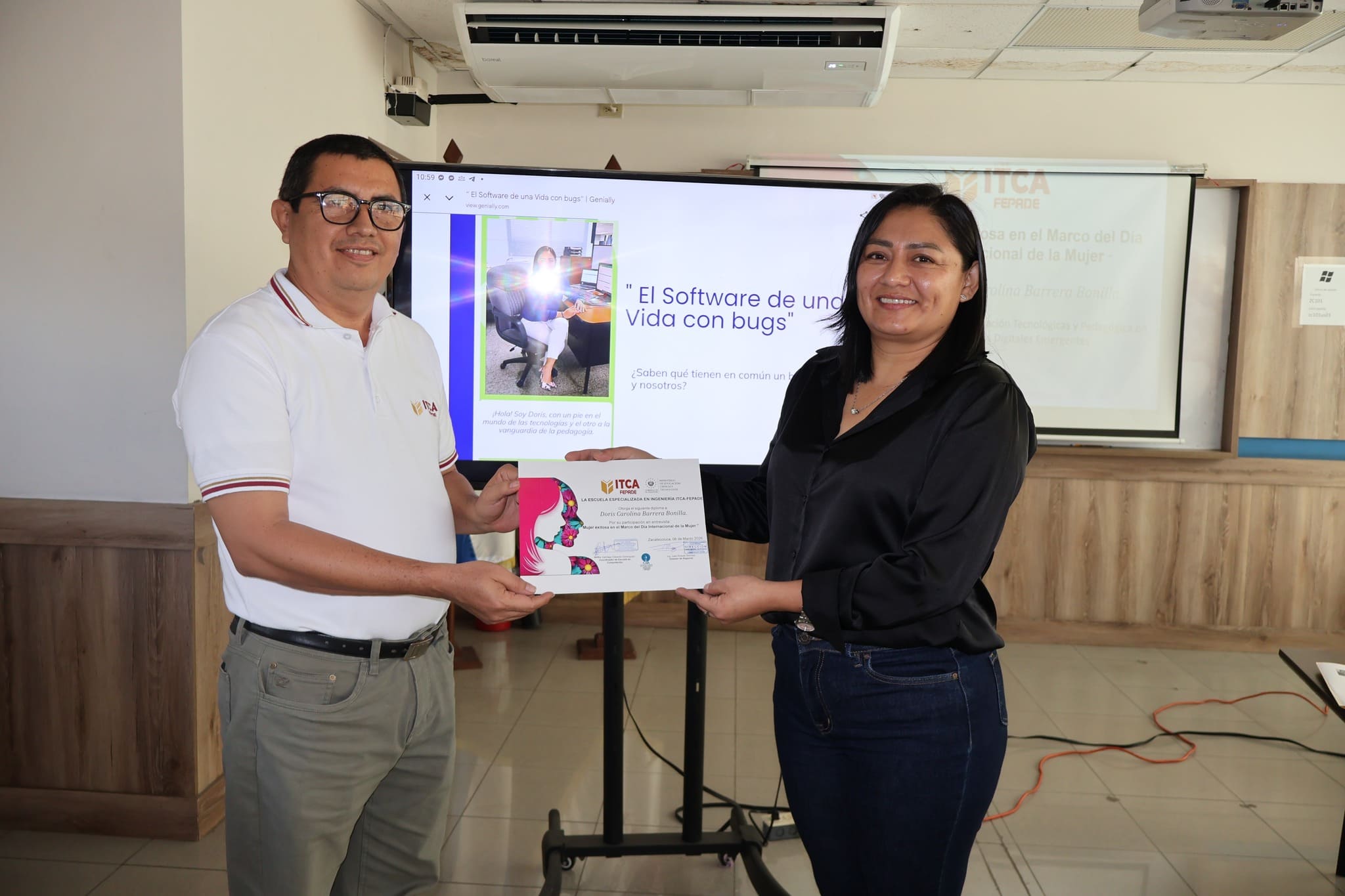 En ITCA-FEPADE Zacatecoluca, el 9 de marzo, Bienestar Estudiantil y la Escuela de Computación desarrollaron la charla motivacional “El software de una vida con bugs”, impartida por la MSc. Doris Carolina Barrera Bonilla, exestudiante de la institución y especialista del MINEDUCYT, quien motivó a los estudiantes de Desarrollo de Software a perseverar en su formación.
